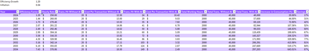 Let's use an overly simplistic example to illustrate the point. Imagine an accountant can perform 20 transactions per hour, and that accountant works 2,000 hours per year, completing 40,000 transactions per year. Then the accountant starts using AI in 2024 and gets a boost in productivity of 20% and can perform 48,000 transactions per year. Assume also that year after year, the accountant continues using better AI systems, further increasing productivity over time.