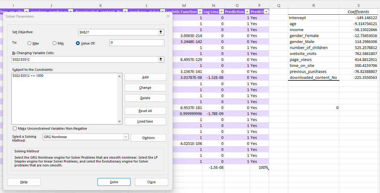 Choose Solving Method: Select the method to reduce the sum of log loss to the value of zero. For logistic regression, you'll typically use the GRG Nonlinear solving method.