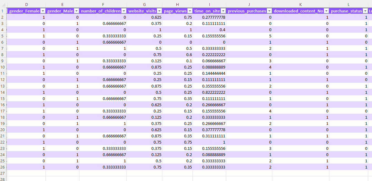 Assign Binary Values: These columns are then filled with binary values corresponding to the presence of the categorical value in the original data. If a particular row had the referral source 'client', it would have a '1' in the referral_client column and '0' in the referral_website and referral_conference columns.