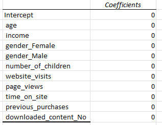 In Excel, you will also need to create a coefficients table and several columns to represent the logistic regression equation components: