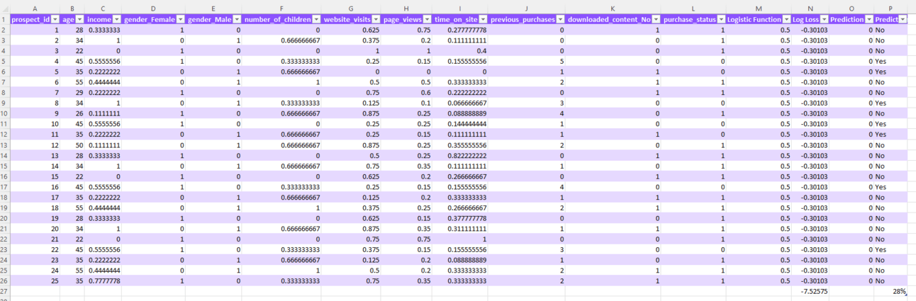 Predicted Outcome Column: Translate the probabilities into predicted classifications based on a chosen cutoff, like 0.5. That means any row with a probability of greater than 0.5 will be predicted as being included in the target group (e.g. a client who purchases the product).