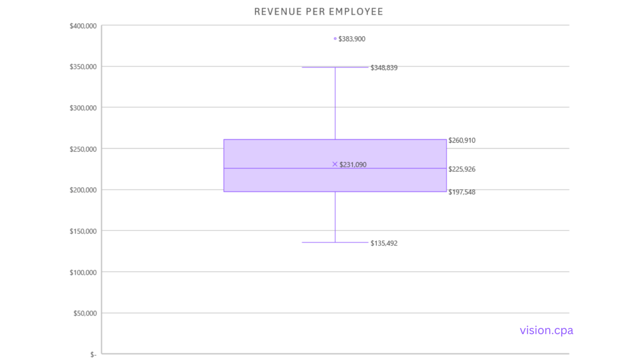 Over time, this metric can tell a story of how firms adapt, innovate, and maximize their human capital. We can see in the box plot above that the average revenue per employee across the top 100 firms is about $230,000. Firm management might look at a benchmark like this and think that every employee should be contributing to another $230k in revenues, and those people who contribute more revenue are overperformers; those who contribute less are underperformers.