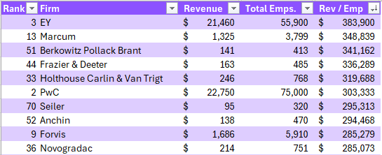 Look beyond the revenue rankings and calculate a Revenue Per Employee ratio. This metric is used across industries, but it's especially important for accounting firms because they are selling people's time, which makes people the most important resource.